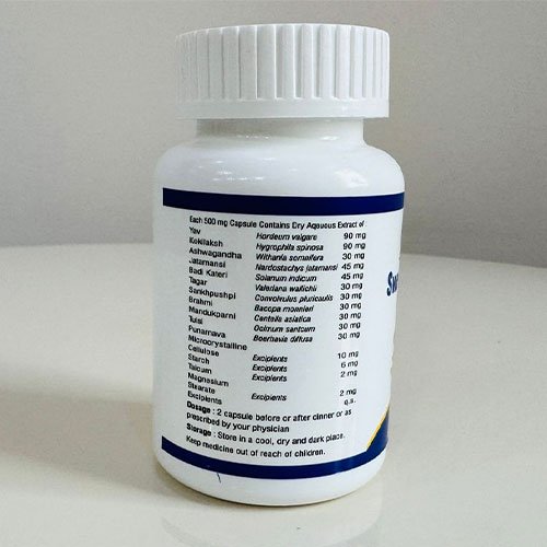 Yav 90 mg, Kokilaksh 90 mg, Ashwagandha 30 mg, Jatamansi 45 mg, Badi Kateri 45 mg, Tagar 30 mg, Sankhpushpi 30 mg, Brahmi 30 mg, Mandukparni 30 mg, Tulsi 30mg, Punarnava 30 mg, Microcrystalline Cellulose 10 mg, Starch 6 mg, Talcum 2 mg, Magnesium Stearate 2 mg, Excipients q.s.